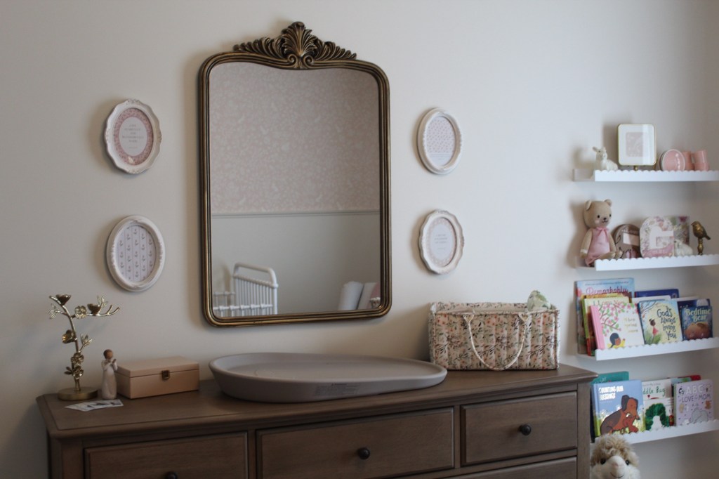 US Wall Decor WallpaperSherwin Williams Egret WhiteNamesake Marin CribMarin DresserNamesake Crawford GliderNathan James End TableWayfair Floor LampAmazon ShelfLight Your Home ArtworkKirklands Oval MirrorTarget Frames Set