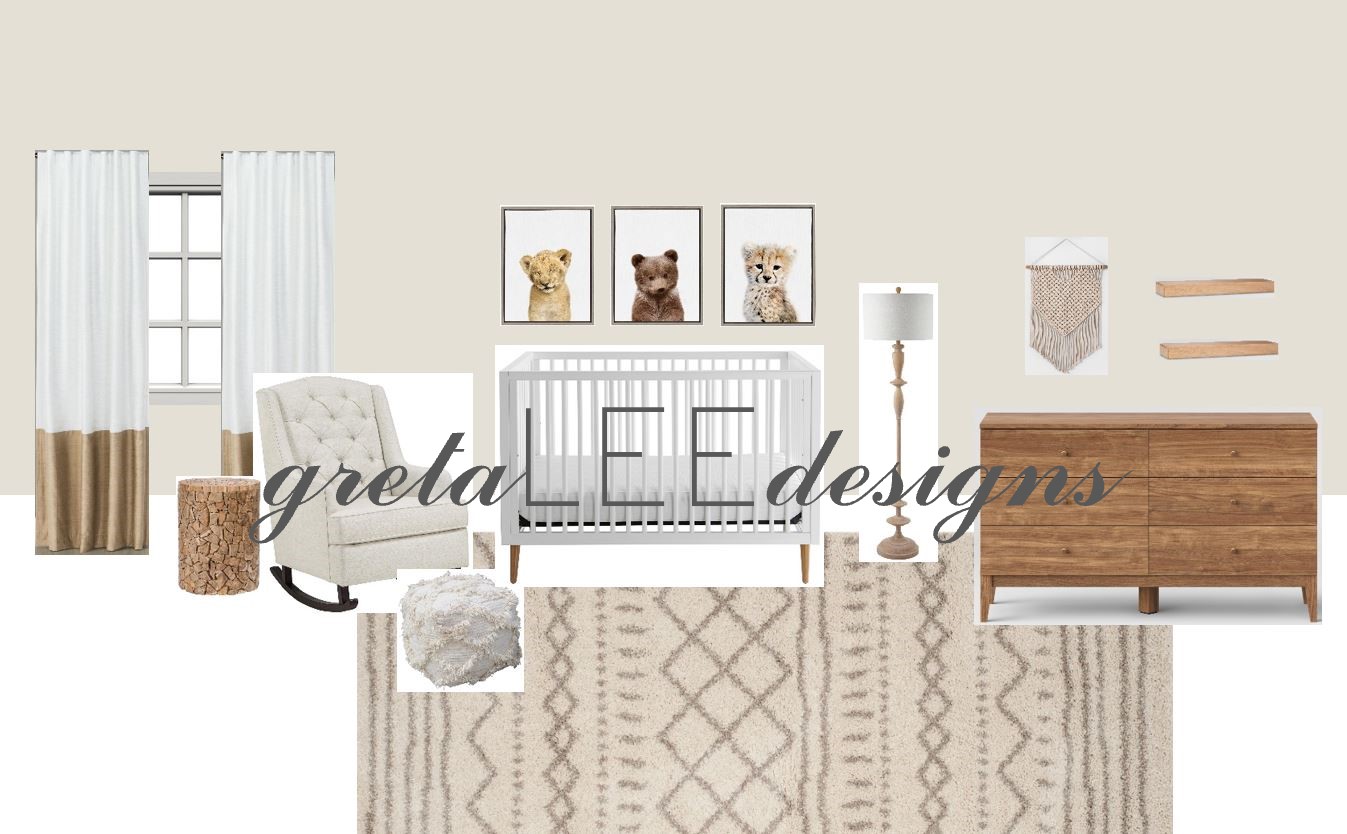 Welcome back! It’s Friday and I have another design series to kick off today. The next 4 designs will be all about wallpaper! It may seem dated, but the fun patterns and colors have really been making a comeback the last few years. I think it adds a special touch to any space, big or small. And in nurseries, the trend is to have an accent wall. Why not add a perfect print to build a design around! I’ve found that US Wall Decor has a really great selection of prints. Today I found this sweet neutral animal print. I loved that I could play more into the grey undertones, with pops of warm neutrals in the picture frames and baskets. Take a look at the design below and let me know what you think! XO – G