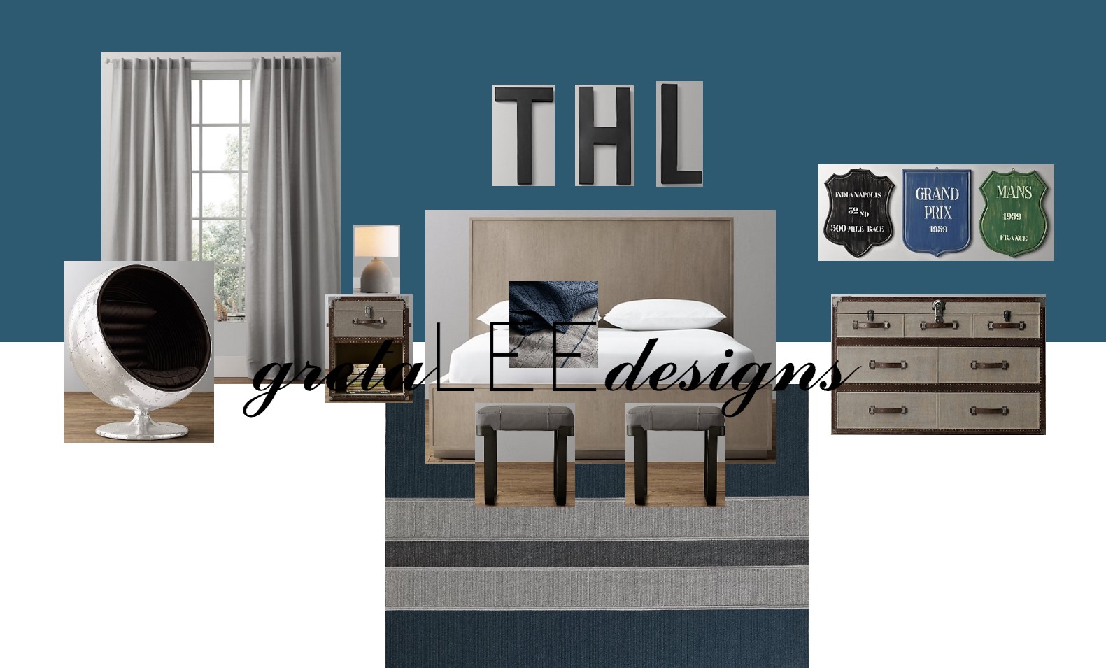 Restoration Hardware Meier Panel BedRH Vance Leather StoolsRH Antique Steamer Trunk Dresser & NightstandRH Orbit Spitfire Leather ChairRH Derby Stripe RugRH Washed Linen-Cotton Drapery in GreyRH Hale Concrete Lamp RH French Shop Metal LettersRH Vintage Raceway ShieldsRH Vintage Baseball Stripe BeddingBenjamin Moore Paint Color in Blue Danube