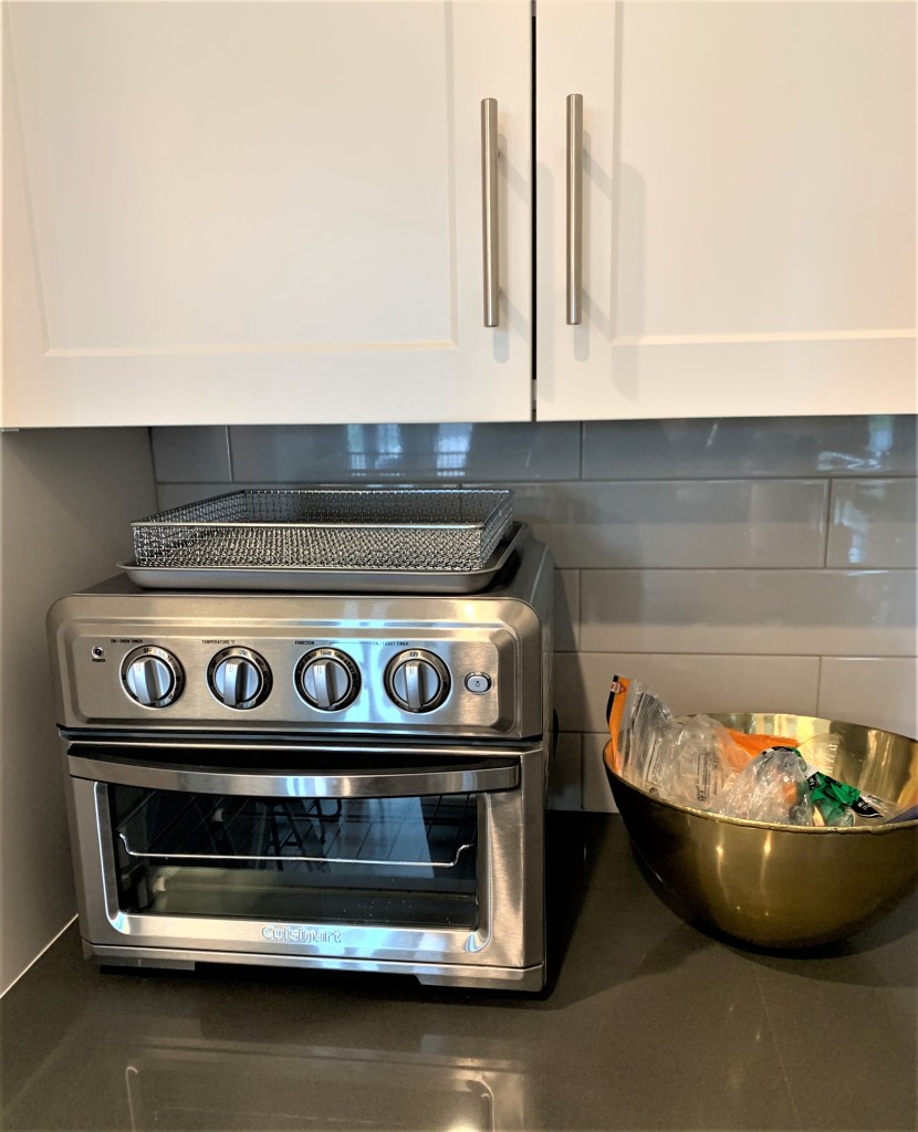 This trick may contradict ‘de-cluttering’, but you can’t set one thing out and allow for it to work on its own. Styling the items you have in your kitchen should be done in pairs, or groups. Like I mentioned with the toaster oven being next to the bread bowl, I paired the two together so it would look more cohesive. I also did this next to the stove top with my salt and pepper shakers and oils. Things that are used often can be left out and styled together to create a flow of design. I then added in little decor elements here and there like a faux plant next to my mixer and a utensil pot on the other side of the stove.
