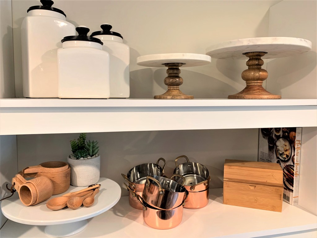 None of the items I used to stylize my kitchen were purchased for that reason. Every appliance and cooking item was bought before because I love to cook and bake fun things! The couple decor pieces were things I picked up knowing I wanted some gold, and green in my kitchen. The two open shelves I have are versatile to style and in any kitchen it should be styled to who the person is. If you are more simple, you may have nothing on your counter, or if you love to entertain you may have more plates and bowls on display. Create a space that is designed for you!